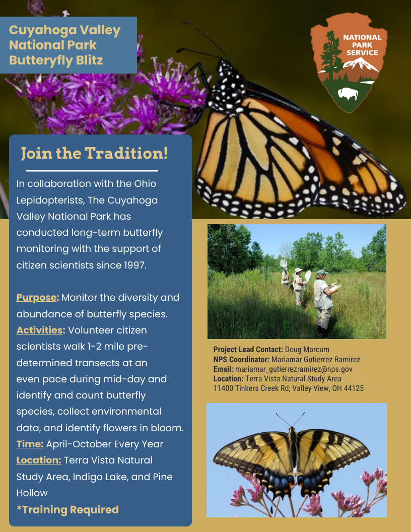S2S has been in contact with officials at Cuyahoga Valley National Park in Ohio, and we have found they have a significant amount of long term citizen science projects with some having as long as a 30 year history! One that caught our attention is their Butterfly Monitoring Project. In addition to the Butterfly monitoring, park volunteers coordinate with rangers to collect data on a host of other species. If you are interested in getting involved in citizen science near Cuyahoga Valley National Park in Ohio, take a look at some of the ongoing research they are doing to protect the park and its natural resources by viewing the flyers below. If anything catches your eye, S2S can help you to get involved at CVNP!